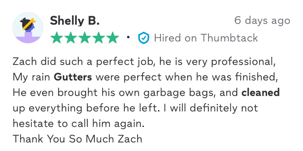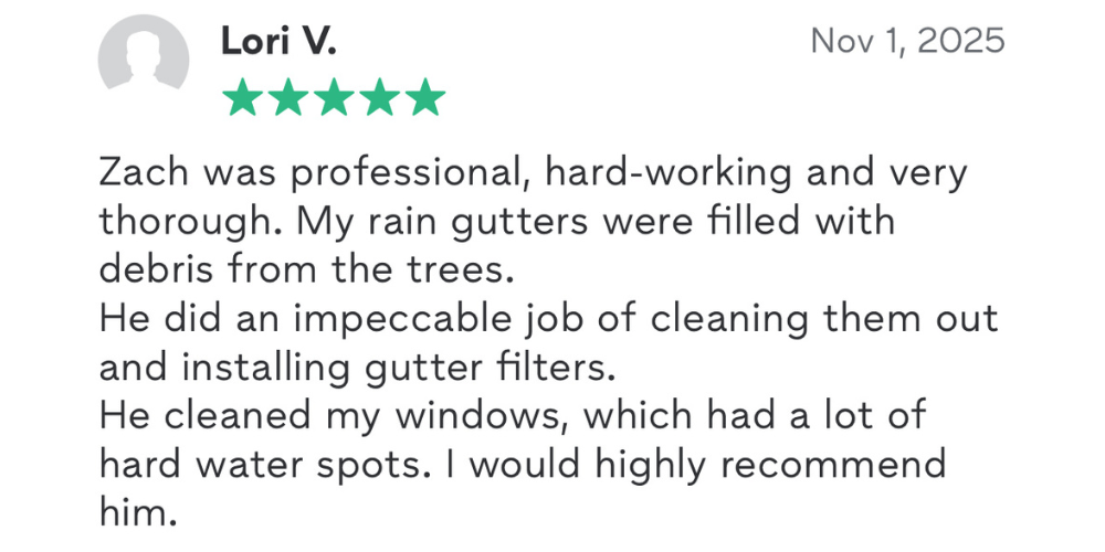 “Zach did an amazing job on our windows! He took his time to make sure every one of them was spotless, and the difference was unbelievable—our whole house feels brighter. He was professional, friendly, and his pricing was more than fair. We’ll definitely be calling Zach’s Window & Gutter Cleaning again!”
